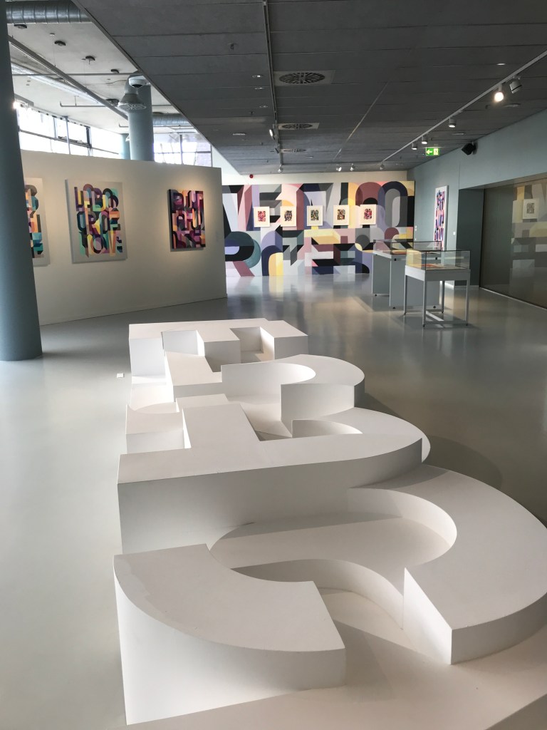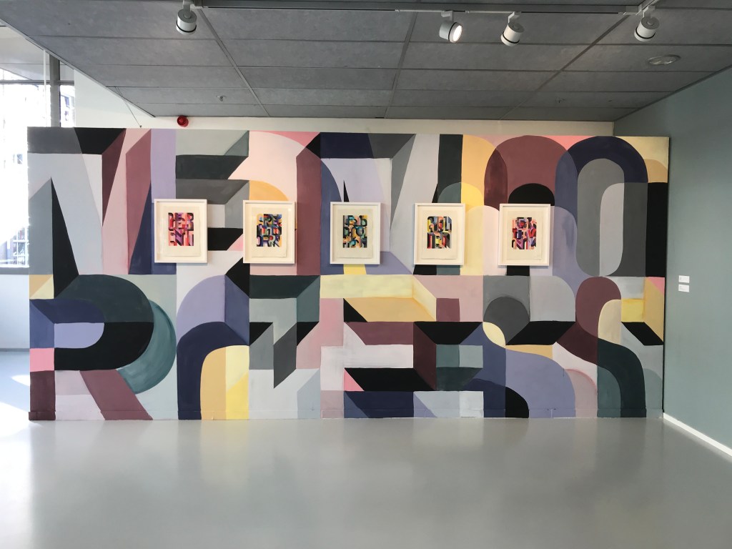 In de kleinere bovenzaal van het museum hangen kleurrijke en bonte schilderijen naast een grote vloersculptuur, en staan bronzen beeldjes op sokkels naast een site specific wandschildering. In elk van de verschillende werken zijn letters en woorden de bouwstenen. De ene keer zijn letters bij elkaar op doek gezet in vlakken en smalle banen die over elkaar heen schuiven en kleurschakeringen maken, de andere keer zijn ze gebruikt in een effen opstapeling van ruimtelijke vormen. De letters zijn niet in een losse-pols handschrift geschreven of in een font met veel krullen en schreven, maar in een zo sec mogelijk uiterlijk, ontbloot van alle frivoliteit en opsmuk zijn ze neergezet als een soort basisvorm. De letters zijn niet goed leesbaar, soms zelfs onherkenbaar en hierdoor krijg ik het idee dat de vorm, de kleur, de vlakken en de schakeringen veel belangrijker zijn en meer te zeggen hebben dan de leesbaarheid of betekenis van de woorden. Toch wil de kunstenaar je wel zover krijgen om tijd te nemen het werk te bekijken, om de letters een voor een te onderscheiden en zo de woorden te lezen.
