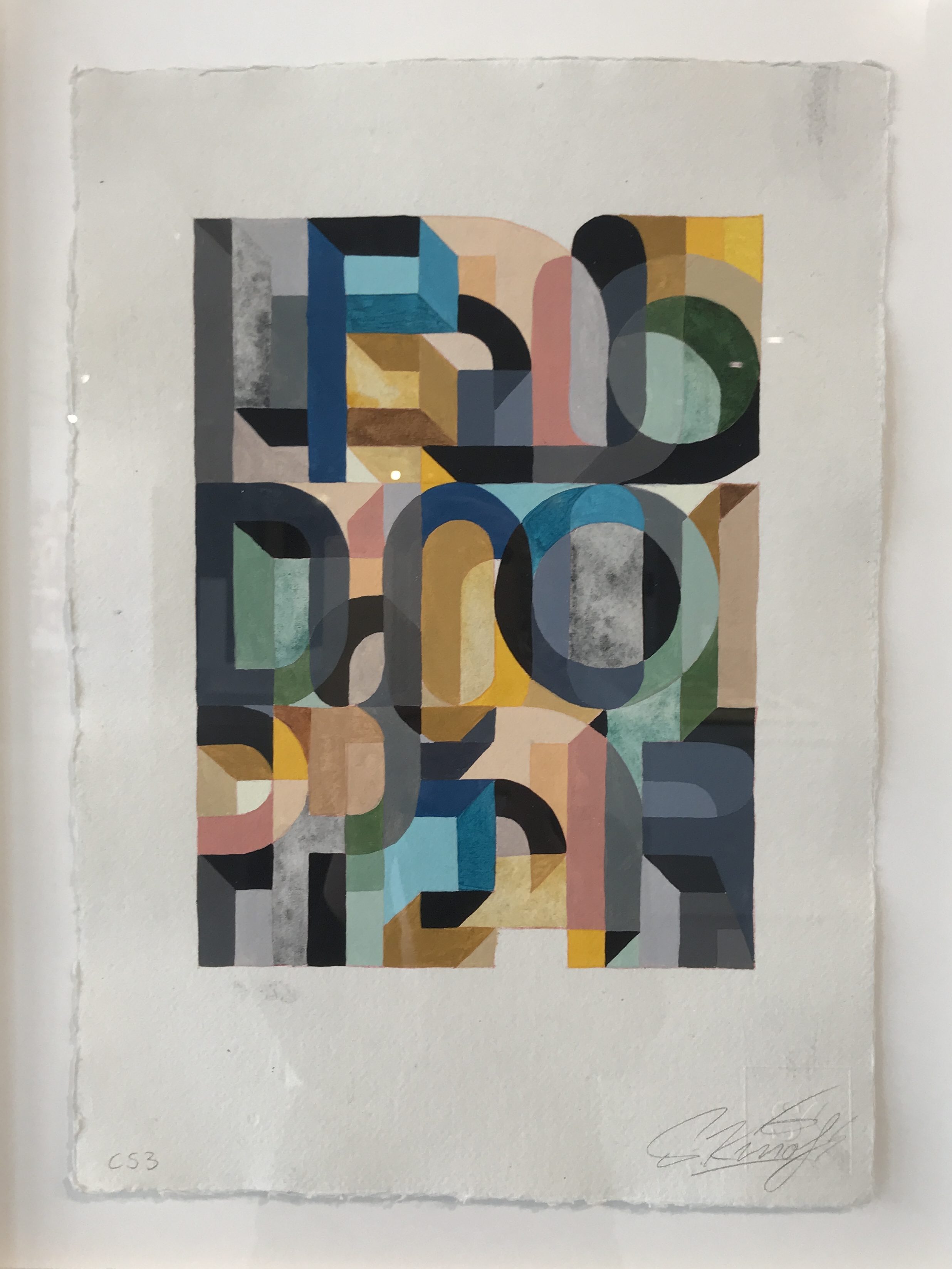 Het zijn ingewikkelde composities en ik speur naar een patroon als een soort referentie: ik zie de manier waarop de stroken overgaan in een volgende kleur en de lijnen op de achtergrond die een verdwijnpunt lijken te zoeken, ik zie waar de kleuren terug komen en waar ze tegen een andere aanbotsen. De schaduwwerking en de lijnen die door een vorm heen lijken te gaan en verderop terugkomen lijken het architectonische spelletjes.