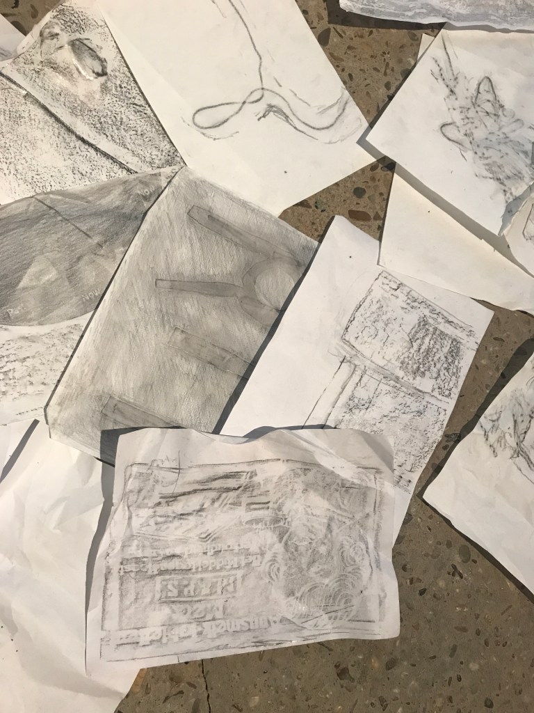 Anook Cléonne neemt met haar werk ‘Stenen Tafels, mapping the unknown’, de bezoeker mee in een zoektocht naar betekenis. Ze maakte stenen tafelen die te lezen en te zien zijn enkel zoals de verbeeldingskracht van de kijker het toestaat. Het zijn kleine tabletten van klei in verschillende kleuren en vormen, ze hangen op een rij aan de muur. Onder het zwarte oppervlak van één van de tabletten zie je andere kleuren tevoorschijn komen, een stukje blauwe klei steekt uit, een onbenoembare vorm in zilvergrijs. De randen van het kleitablet zijn dofzwart, in het midden is een glimmend zwarte rechthoek gemaakt. Je ziet de hechting van de klei, de gebroken stukken en de rafelige rand. Je ziet de imperfecties en de mogelijkheden.