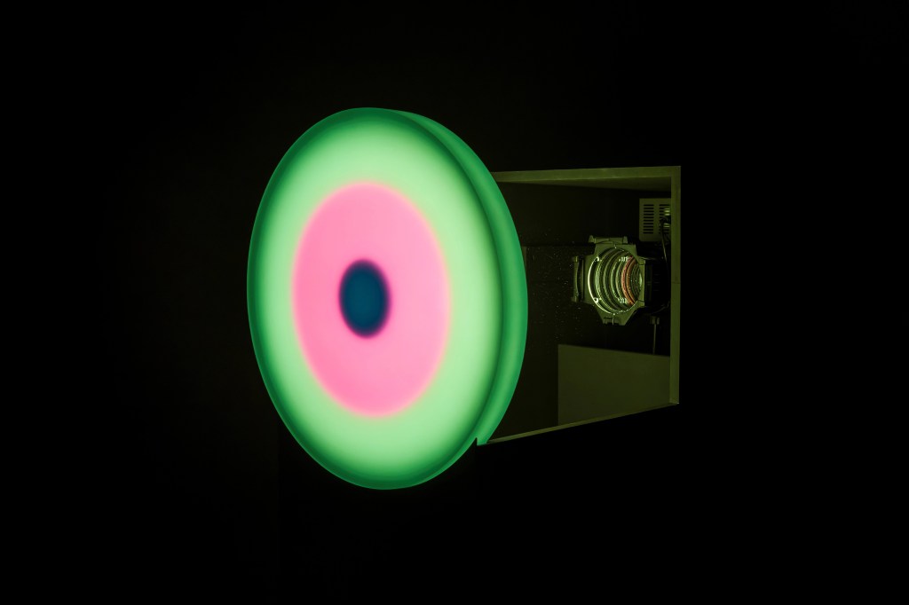 Ook in You Are Here verschijnt en verdwijnt zo’n stip, maar hier krijgt deze wel een materiële vorm, zij het een kleine en bevreemdende. Op een ronde schijf van polyesterhars is een opeenvolging van gekleurde cirkels te zien. De cirkels vormen zich om de stip in het midden, worden steeds breder tot de kleuren veranderen van lichtblauw naar intens roze en geel. De randen van de cirkels zinderen van felheid en focussen is lastig; de stip speelt met je ogen en ook het nabeeld verspringt steeds van plek. Dan vouwt het beeld zich weer in elkaar, de ringen worden naar het midden gezogen. De stip krimpt langzaam van groot naar klein tot een heel klein puntje dat bijna helemaal in het niets verdwijnt.